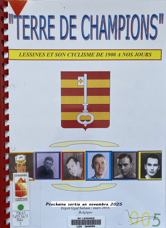 C’est en 2013 que nous avons dĂ©butĂ© « TERRE DE CHAMPION » – « LESSINES ET SON CYCLISME DE 1900 A NOS JOURS ». L’analyse d’archives et du porte-porte nous ont permis de l’Ă©laborer. Le livret a Ă©tĂ© imprimĂ© Ă une centaine d’exemplaires. Claudy CRIQUIELION, alors Echevin de la Ville et ancien champion du monde, avait Ă©crit le prĂ©ambule. Il nous avait bien aidĂ©. Outre les explications utiles Ă la lecture des fiches, une liste est jointe en annexe. Elle Ă©nonce les centaines de lessinois qui se sont adonnĂ©s Ă la compĂ©tition (clubs/palmarès/anecdotes/…).