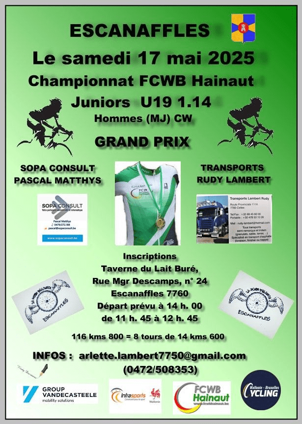 La « ROUE VOLANTE » est une fois de plus au four et au moulin. En effet, le « GP SOPA CONSULT ET TRANSPORT LAMBERT » sera organisĂ© Ă ESCANAFFLES le 17 mai. Un « CHAMPIONNAT FCWB » pour JUNIORS (règlement particulier). Ils sont plus d’une centaine Ă ĂŞtre attendus dans cette localitĂ© proche de Tournai. DĂ©part dès 14.00 de la Taverne « DU LAIT BURE ». 116 km rĂ©partis en 8 circuits.