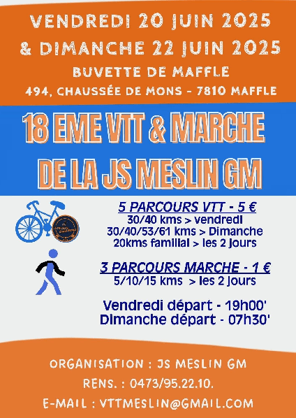 La « JS MESLIN/GRAND MARAIS » en est Ă sa 18 Ă©dition de sa randonnĂ©e VTT. Toutes les informations utiles sont sur l’affiche. Vous n’ĂŞtes pas des adeptes de vĂ©lo ? Pas de problème. Il y a Ă©galement de la marche.
