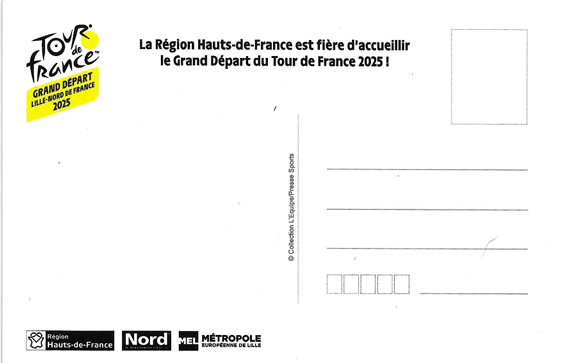 Carte postale Ă©ditĂ©e par « REGION HAUTS-DE-FRANCE », « NORD » et « MEL » dans le cadre des prochaines Ă©tapes nordiques du « TOUR DE FRANCE ».
