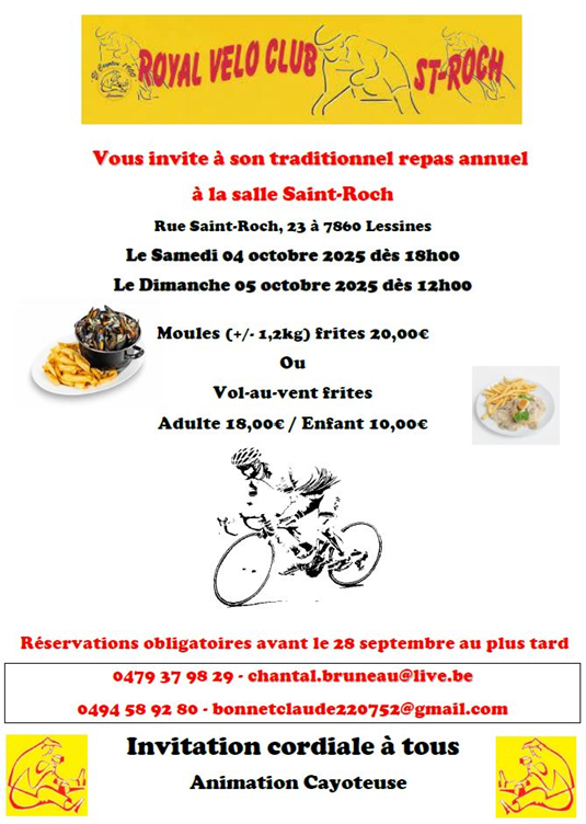 Mr Eric SOYEZ, Président du « ROYAL VELO CLUB SAINT-ROCH » de LESSINES nous demande de bien vouloir vous informer des modalités du prochain « SOUPER ANNUEL ».