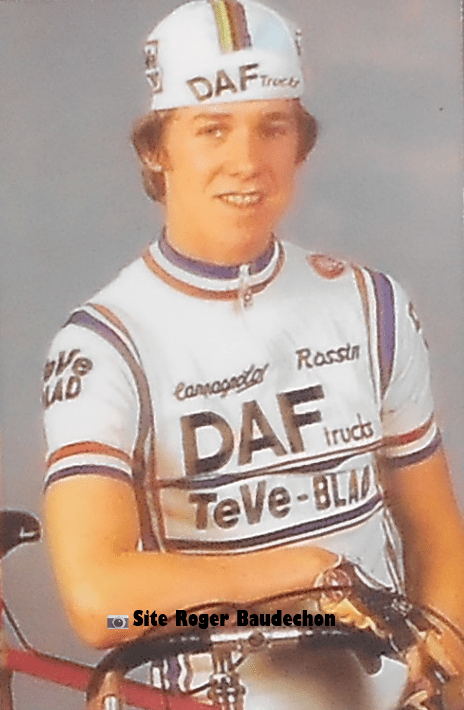 RĂ©ponse : Et, c’est Marc VANDENDOOREN qui a trouvĂ© ce personnage en entĂŞte. En effet, il s’agit de la première tenue professionnelle pour Dirk DEMOL (Bel – 65 ans). 1982 – il entre chez « DAF TRUCKS – TEVE BLAD – ROSSIN ». Il a cĂ´toyĂ© : Roger DE VLAEMINCK, Hennie KUIPER, Hennie STAMSNIJDER, Adrie VAN DER POEL, William TACKAERT, Guy NULENS, … . Durant cette saison, il fera : 2eme « GP DU TOURNAISIS », 7eme « KUURNE-BRUSSEL-KUURNE », … . Un grand coureur et un très bon directeur sportif. Il est sur site avec plusieurs posts.