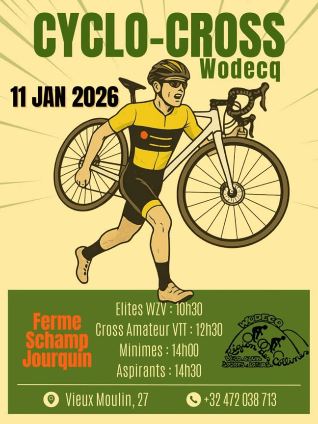 WODECQ et le « VELO-CLUB SPORTS ET LOISIRS » local, c’est une longue histoire dans le cyclisme. En continu durant des dĂ©cennies, avec des Ă©preuves routiĂšres, dames et messieurs. Et du cross. Les bĂ©nĂ©voles se sont succĂ©dĂ©s pour permettre Ă ce club de rester sur le devant de la scĂšne. Une fois de plus en 2026, les organisateurs vont dĂ©buter avec le traditionnel CYCLO-CROSS + VTT de la FERME SCHAMP-JOURQUIN. La premiĂšre manche de la journĂ©e est aux mains de la fĂ©dĂ©ration « WVZ ». Les places sont limitĂ©es, les inscriptions nĂ©cessaires. Ensuite, il y a trois possibilitĂ©s pour les amateurs CC-VTT (payant) et les plus jeunes (gratuit). Le parcours va changer ! Vu la configuration des lieux, il ne fait aucun doute qu’il sera aussi intĂ©ressant que celui des saisons antĂ©rieures. Voyez le programme affichĂ© et n’hĂ©sitez pas Ă vous rendre sur la page FB des wodecquois – date limite des inscriptions (jeunes) !!!!.