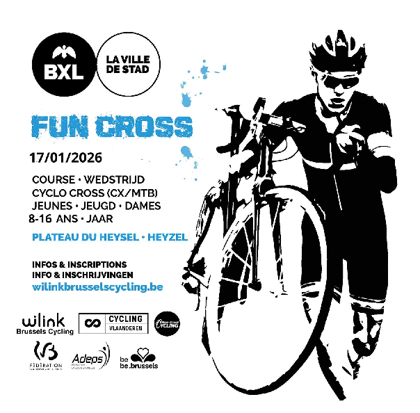 Samedi 17 janvier, les amateurs de cyclo-cross ont rendez-vous sur le « PLATEAU DU HEYSEL », au pied du Stade Roi Baudouin et Ă deux pas de l’Atomium. Le 4e « FUN CROSS BRUSSELS » organisĂ© par « WILINK BRUSSELS CYCLING » et « BRUSSELSSPORT » dĂ©butera Ă 10.00. Courses rĂ©servĂ©es aux CC et VTT pour les 08-16 ans D/M. Les inscriptions sont ouvertes !!!