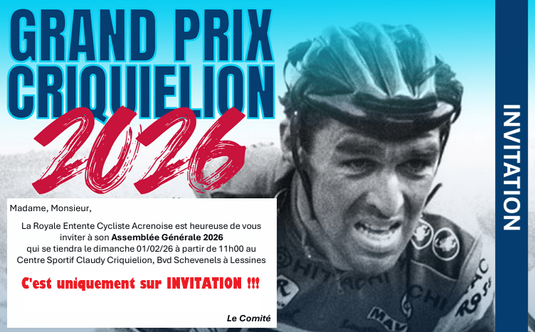 Le 01 fevrier 2026, la « ROYALE ENTENTE CYCLISTE ACRENOISE » tiendra son AssemblĂ©e GĂ©nĂ©rale au « CENTRE SPORTIF CLAUDY CRIQUIELION ».