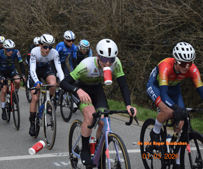 Nous n’allons pas forcĂ©ment sur les courses pour glaner des bidons. Maintenant, lorsque vous vous trouvez dans un RAVITO, ils pleuvent inĂ©vitablement de partout. Contrairement aux pros, les soigneurs les ramassent – souvent – pour les utiliser plusieurs fois. Sur « KUURNE-BRUSSE-KUURNE » des JUN, deux gourdes se sont retrouvĂ©es Ă nos pieds. Pas trop le temps de les ramasser car pour voir les coureurs passer et prendre quelques clichĂ©s, des choix s’imposent. Au moment de partir, celui des « ONDER ONS PARIKE » Ă©tait toujours lĂ . Un de plus pour la collection. Nous ne rechignons pas Ă un accessoire.