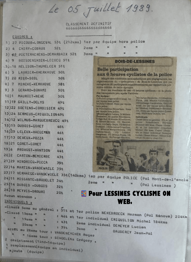 Nous n’irons pas jusqu’Ă vous remĂ©morer toutes les endurances mises en place par la « POLICE COMMUNALE » de LESSINES. Il y en a un paquet. Jean-Claude DELHAYE – INPP 1ere classe – Ă©tait un vĂ©ritable mordu. Il fallait le suivre đ. Il pensait vĂ©lo, dormait vĂ©lo, mangeait vĂ©lo et circulait Ă vĂ©lo. Une partie d’entre elles se trouvent sur ce site. Une Ă©poque durant laquelle les relations humaines Ă©taient primordiales. Le cyclisme Ă©tait trĂšs populaire – au noble sens du terme.