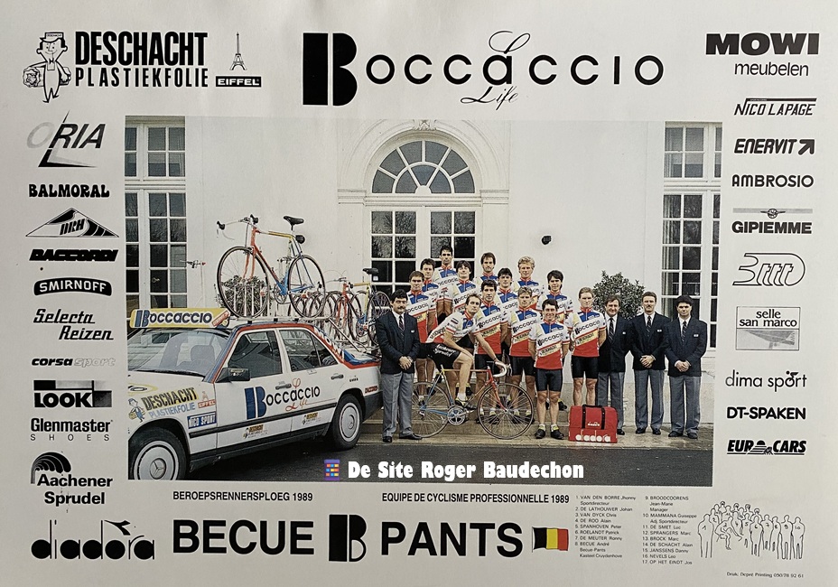 Une Ă©quipe cycliste qui avait pour sponsor le « BOCCACCIO LIFE », un mĂ©ga-dancing de Destelbergen, c’Ă©tait assez inĂ©dit. Quoique, dans ces annĂ©es-lĂ , tout le monde recherchait de la visibilitĂ© dans le vĂ©lo. En ce y compris un des plus grands Ă©tablissements de Belgique et d’Europe. Il Ă©tait un prĂ©curseur en matiĂšre de musique Ă©lectronique. Il a Ă©tĂ© fermĂ© en 1993. Il a repris sous d’autres noms par la suite. « FONDUA » est une marque d’appareils pour de la fondue. Les sauces « LA WILLIAM » sont quelques fois citĂ©es. Idem pour « NICO LAPAGE » qui Ă©tait une fabrique de vĂȘtements sportifs. « DACCORDI », les vĂ©los. Quant Ă « MOWI », c’Ă©tait une firme de meubles. « DESCHACHT » est plus frĂ©quemment sur les maillots. Il s’agit d’une sociĂ©tĂ© de fabrication de plastiques.
