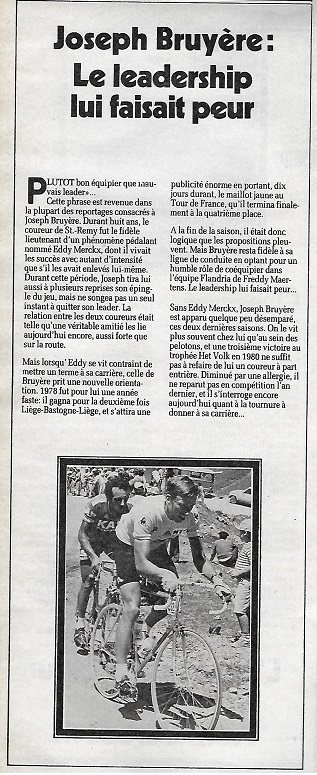 Il disait : " Plutôt être bon équipier que mauvais leader". Et c'est vrai que MERCKX était son phare. Il se dépensait sans compter pour le mener à la victoire et quand son grand maître a décidé d'arrêter, c'est lui qui s'est mis à gagner mais pas pour très longtemps puisqu'il a continué de rouler … Lire la suite JOSEPH BRUYÈRE, UN LIEUTENANT HORS NORME.