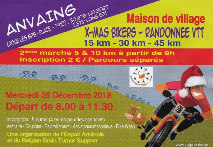 Voici l'affiche très complète de "L'ESPOIR ANVINOIS" (très ancien club) et du "BELGIAN BRAIN TURNOR SUPPORT" de Anvaing. Marche et VTT sont au programme. Une belle région et une belle date pour déjà commencer à éliminer les toxines de la veille. Rien de plus à dire, tout est en entête !!! ANVAING, c'est entre Renaix, … Lire la suite VTT ET MARCHE A ANVAING #26décembre