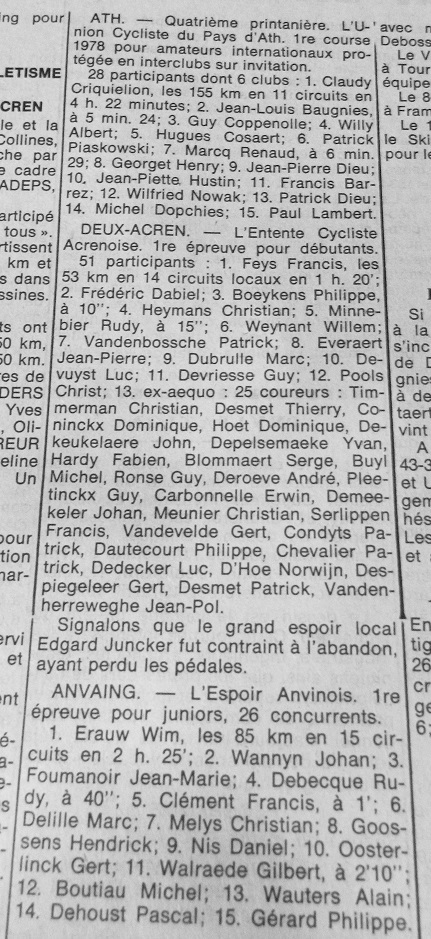 Photo. Article de 1978 extrait du journal lessinois "Le Postillon". Autrefois, la région regorgeait de coureurs et de courses. Toutefois, il n'est plus trop temps de nous lamenter, il faut POSITIVER. D'ailleurs, la FCWB vient de prendre une bonne décision en embauchant Christophe PREMONT, (ancien pro) comme directeur technique. Le vainqueur de GHOY et de … Lire la suite 1978. QUELQUES COMPÉTITIONS LOCALES. #LePostillon
