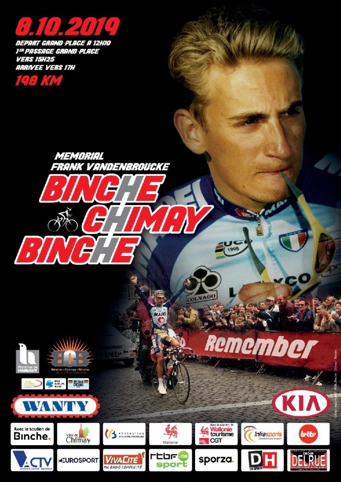 Affiche. "MEMORIAL FRANK VANDENBROUCKE". Les organisateurs de "BINCHE-CHIMAY-BINCHE" n'oublient pas qu'il y a près de dix ans que VDB n'est plus de ce monde. 10 ans !!! Le niveau sera encore une fois très relevé. Qui succédera à Danny VAN POPPEL vainqueur l'an dernier ? Nous reviendrons en détail sur cette épreuve dans les prochains jours. … Lire la suite A VENIR. « BINCHE-CHIMAY-BINCHE ». #08/10/2019.
