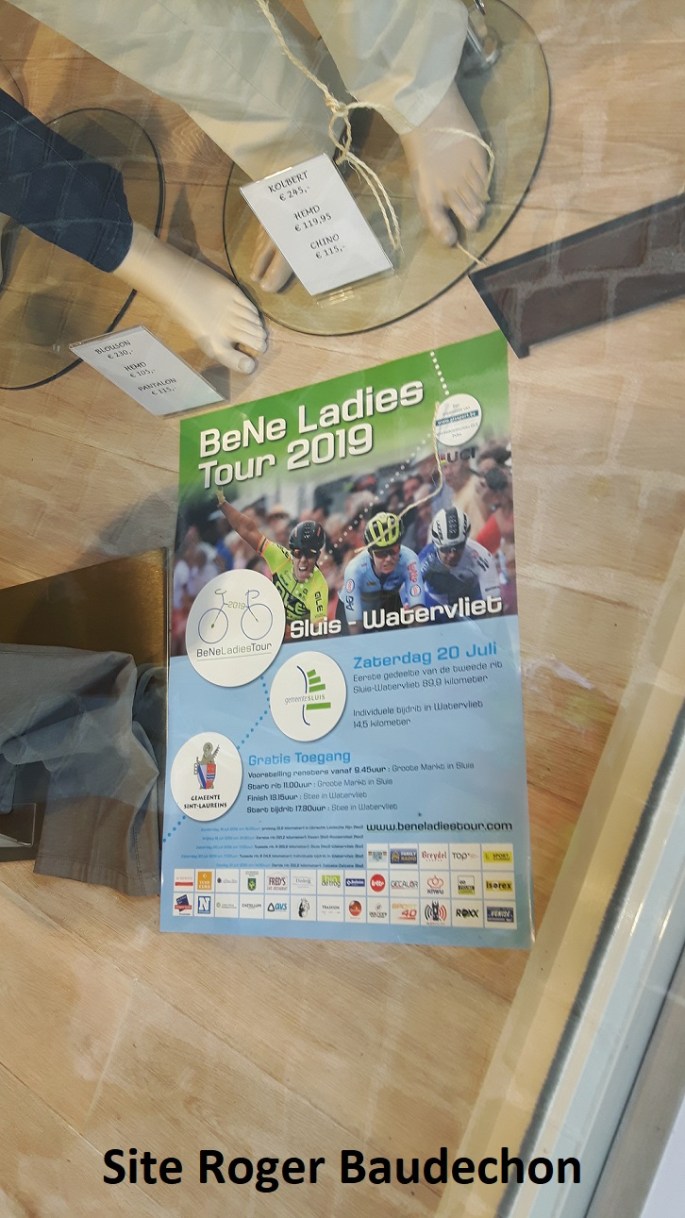 Dans les vitrines des magasins de SLUIS, les commerçants affichent leur soutien au "BENE LADIES TOUR". L'épreuve par étapes pour dames se déroule, principalement aux Pays-Bas. Les dates : du 18 au 21 juillet 2019. Samedi, elle fera une halte à Sluis-Watervliet. Dimanche, ce sera à Zelzate. Cinq équipes belges y sont inscrites.