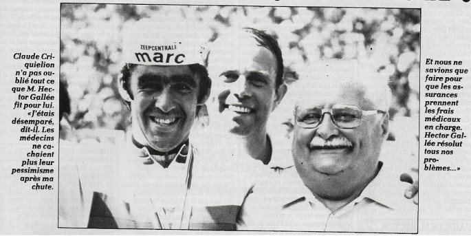 Corrigé, le 30/01/2019. Photo. Mr Hector GALLEE est à droite sur l'image. Claudy CRIQUIELION a dit : "Sans l'aide de Mr GALLEE, j'aurais perdu une fortune dans les hôpitaux". Alors qu'il participait à l'épreuve de Saint-Maur, (juniors) il s'accroche avec Jean-Luc VANDENBROUCKE aux abords de la ligne d'arrivée. Une partie de sa saison fut gâchée … Lire la suite « SOUVENEZ-VOUS » : Hector GALLEE.
