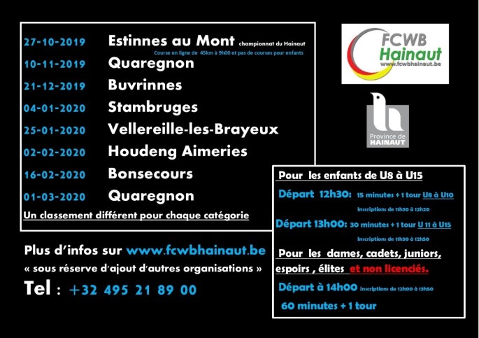 L'ASBL "TOUT TERRAIN" en sera à sa onzième édition du "VTT DES ÉOLIENNES". La région de DOUR regorge de coins pittoresques. Il y a également de la marche. Chemins et sentiers vont vous permettre de mettre du braquet. C'est assez roulant. L'entrée des "Hauts-Pays" a de beaux reliefs. WIHERIES > à 45 min de Lessines. … Lire la suite VTT/MTB-WIHERIES-17/11/2019.