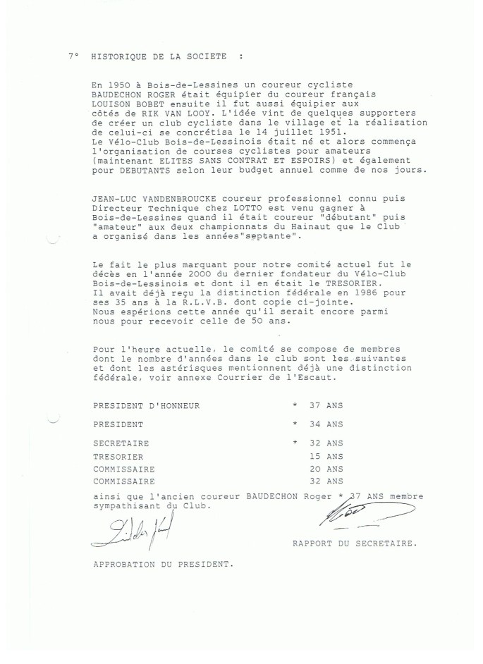 Corrigé, le 13/11/2019. Photo. Cette page est une de celles qui a servi au "VC BOIS-DE-LESSINES" afin de rédiger un dossier pour l'obtention du titre de société ROYALE. Il est constitué à l’initiative de Gérard QUITELIER. Elle nous intéresse d'autant plus que Jean-Luc VANDENBROUCKE y est mentionné pour étayer la valeur des épreuves du club. Le … Lire la suite « SOUVENEZ-VOUS » : Jean-Luc VANDENBROUCKE. #2eme #2019