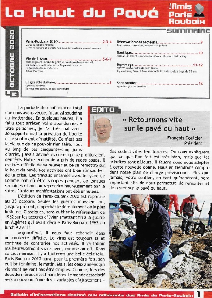 Photo. Page d'entête de "LE HAUT DU PAVE" OCTOBRE 2020. La brochure d'OCTOBRE 2020 des "AMIS DE PARIS-ROUBAIX" est sortie alors que la course n'avait pas lieu. Les "amis" ont bien fait de ne pas passer cette brochure à la déchiqueteuse. Elle est toujours aussi intéressante, sur papier glacé et son contenu vaut le détour. … Lire la suite « LU POUR VOUS ». #2020