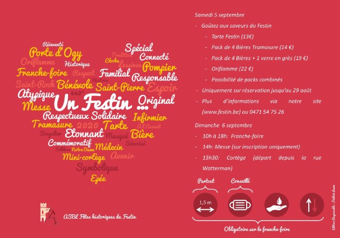Affiche. Contrairement au "CAYOTEU", le "FESTIN" aura lieu mais de manière plus modeste. Il faut bien avouer que septembre n'est pas le mois d'août. Les conditions sanitaires ont évolué. Alors, ce weekend, il y aura de l'animation en ville. Samedi, ce sont des packs alimentaires à emporter. Dimanche, la "FRANCHE-FOIRE" est programmée de 10 à … Lire la suite « LE FESTIN » LESSINOIS A BIEN LIEU. #2020
