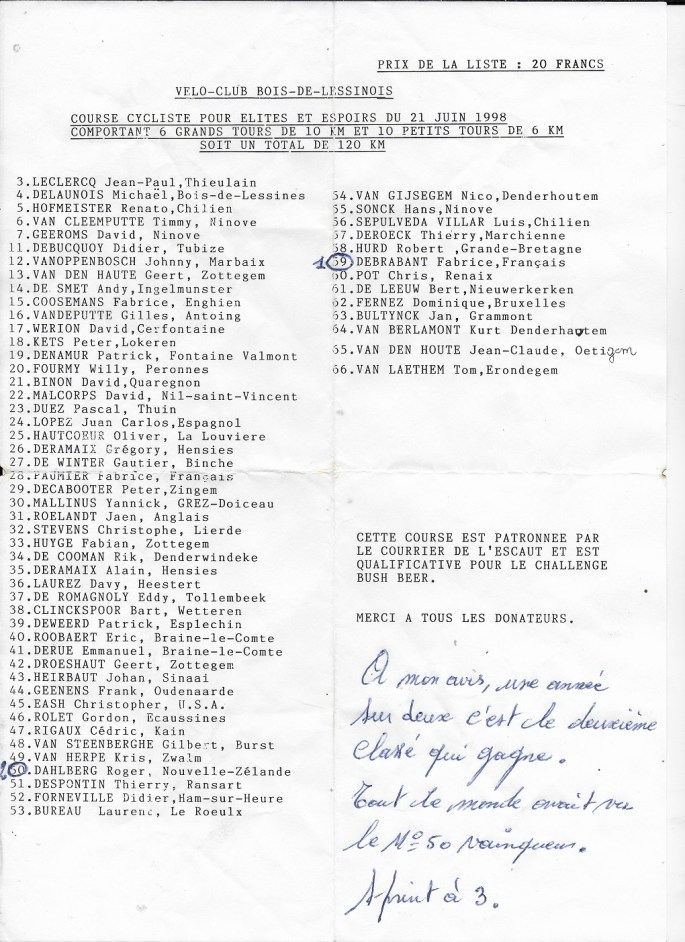 Mis à jour. Photo. La liste des partants qui nous est donnée par AlbertL ( "L" pour LOUEL - rappel) Merci à lui. Le "VÉLO CLUB BOIS-DE-LESSINOIS" a souvent organisé deux épreuves. Une par kermesse. En juin et en septembre. Quelques années auparavant, nous parlions encore des "amateurs internationaux". La nouvelle appellation était relativement récente. … Lire la suite 1998, LES ÉLITES SC ET ESPOIRS A BOIS-DE-LESSINES. #DE WINTER Gautier #2020