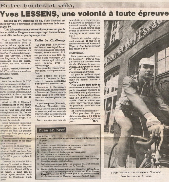 Photo. D'un journal. Le "Courrier de l'Escaut" certainement. Il est devant la façade. Yves LESSENS est un ancien coureur de la commune de HELLEBECQ. (quasiment accolée à Lessines) Son papa René, mais aussi sa maman et sa sœur ont toujours été des acharnés de cyclisme. Idem pour son épouse et ses beaux-parents. Évoluer dans un … Lire la suite « C’ÉTAIT HIER ». #PasséLointain #Y.Lessens #2020