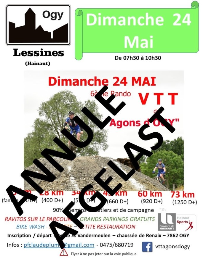 Mr Paul Emile DECLEVES vient de nous aviser que compte-tenu des conditions actuelles, le "VTT DES AGONS" n'aura pas lieu. Son comité nous donne rendez-vous en 2021. Merci pour l'envoi de cette information officielle. Les activités lessinoises sont annulées les unes après les autres. Nous espérons que les organisateurs seront capables de se remotiver quand … Lire la suite PAS DE VTT A OGY. #2020