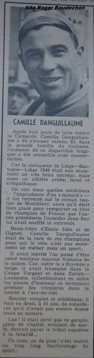 Texte sur Camille DANGUILLAUME. Un "DANGUILLAUME" !!! ??? Était-il de la même famille que Jean-Pierre ??? Et bien oui. C'est l'oncle de Jean-Pierre DANGUILLAUME qui a été coureur pro et directeur sportif dans les années 1970 (1970 à 1978). Son frère Jean-Louis a d'ailleurs aussi été pro. Mais revenons à Camille. Il avait quatre frères … Lire la suite « SOUVENEZ-VOUS » : Camille DANGUILLAUME. #2021