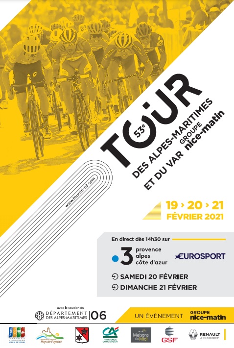 Affiche. La FRANCE n'abdique pas. Les compétitions continuent. C'est maintenant au "TOUR DES ALPES MARITIMES ET DU VAR" de se produire du 19 au 21 février. Voici quelques informations concernant cette épreuve. EQUIPES-PARTANTS ETAPES EN TV "EUROSPORT". Ecrit sur "DIRECT VELO". Idem sur "SPORZA" live.