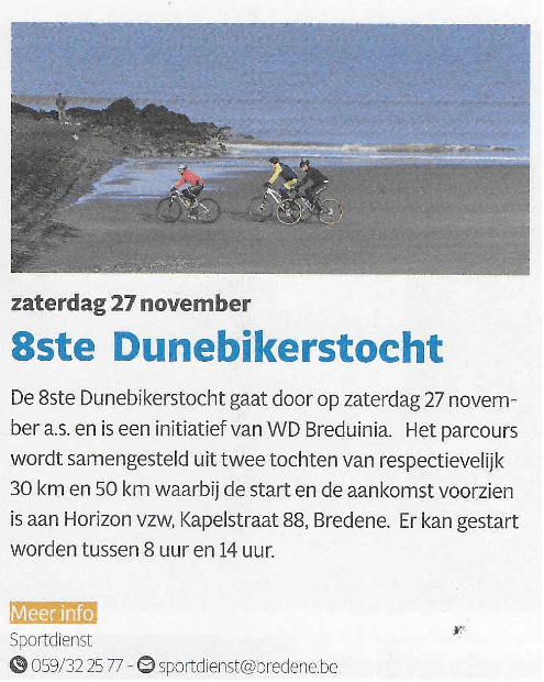 Affiche. Lue dans la TRIBUNE de BREDENE de Novembre/décembre. Pour information. En ces mois de novembre/décembre, la cité balnéaire de BREDENE (et d'autres) feront le plein d'activités axées sur le VTT-MTB. Nous devrions en être !!! Mais probablement pas sur toutes.