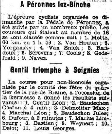 Krant. (06/09/1937) Veel dank aan Jozef THIELEMANS die ons een artikel stuurde over de twee ooms - nonkels van Roger Baudechon. Gaston (grootvader) en Jules waren grote renners. Jozef was ook een zeer goed. We gaan een « SOUVENEZ-VOUS » maken voor de maand januari. Misschien met vintage foto's. (1960) Bedankt Jef !! Groeten !!!