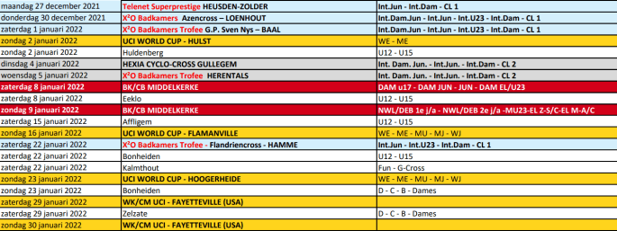 Tableau "BELGIAN CYCLING". Un mois crucial se profile à l'horizon. "BELGIAN CYCLING" vient de réagir en demandant aux autorités de lever l'interdiction de public sur le cyclocross. Voici le tableau des prochaines semaines. Avec ou sans spectateurs, organisés ou pas, janvier risque bien d'être sous tension. De plus, avec un variant qui est annoncé très … Lire la suite LA SUITE DE LA SAISON DE CROSS. #2021-2022 #2021