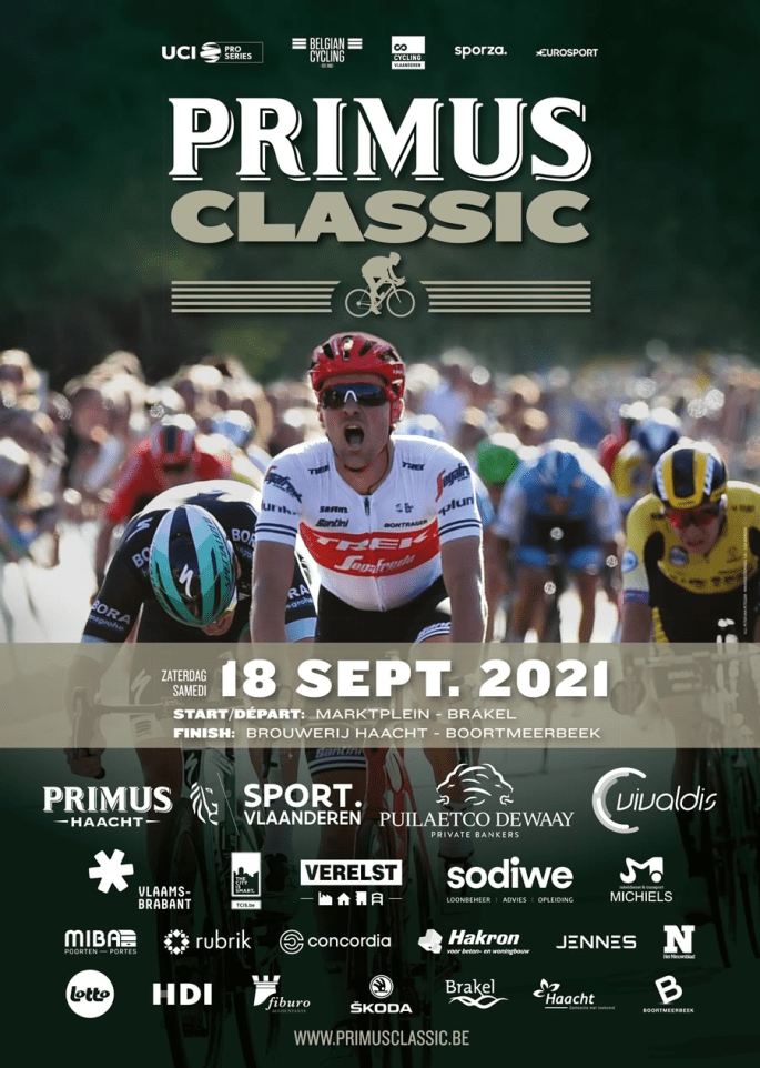 Mis à jour. Affiche. Encore une "belle" aux portes de notre entité !!! En effet, la "PRIMUS CLASSIC" ("IMPANIS/VAN PETEGEM KOERS") aura pour lieu emblématique la Place de BRAKEL. Signature des coureurs sur le podium dès 11h30. Départ à 12h45. Arrivée à BOORTMEERBEEK vers 17h30. Un peloton conséquent est inscrit comme de coutume. Circuit. Vous … Lire la suite « PRIMUS CLASSIC ». #ToutOuPresqueSurLaCourse #18/09 #2021