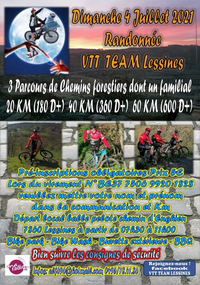 Affiche. Toutes les informations relatives à la randonnée VTT organisée par le "TEAM LESSINES" sont contenues dans l'affiche ci-dessus. Rendez-vous le 04 juillet au Théâtre de Verdure (à l'arrière, au jeu de balle). Pour tout complément, veuillez contacter DavidL. L'affiche reste en colonne droite du site jusqu'au jour de l'événement. Une affiche réalisée par David … Lire la suite UNE RANDONNEE VTT A LESSINES. #TeamLessines #04/07/2021