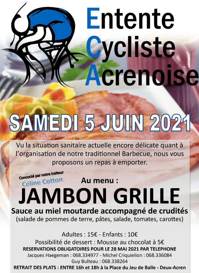 RAPPEL DU 10 MAI !!! DERNIERE LIGNE DROITE POUR RESERVER !!! Si vous souhaitez soutenir ce club cycliste, c'est le moment. Merci à GuyB pour le passage de l'information. (affiche couleur) Et à JudithF qui avait trouvé la noir et blanc. Vous avez tout ce qui est nécessaire sur l'affiche en entête !!! A Vos … Lire la suite SOUPER DE « L’ENTENTE CYCLISTE ACRENOISE ». #05/06/2021