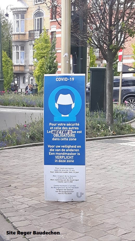 Corrigé. Dans cette zone de Uccle, le masque est obligatoire. Mais c'est non sans humour que certains habitants ont "déguisé" les panneaux. Notons tout de même qu'il n'y en a pas 7/10 qui portent l'accessoire exigé !!!