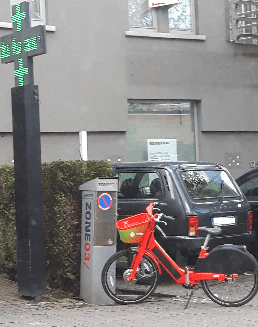 Photo. A Uccle, il y a des choses bizarres !!! Nous avons même vu un bac "VEDETT" (bière) servant de panier sur un " VELIB' ". "Mais c'est vrai qu'il est rouge ce vélo. Il a bien raison de se rendre à la pharmacie. Comme pour le vaccin, le DAFALGAN devrait certainement l'apaiser !!! Hohohohoho … Lire la suite HUMOUR !!! #VisitBrussels #2021