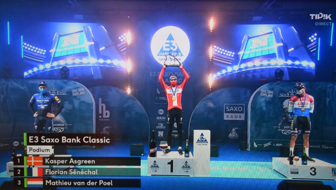 Image. Le podium. C'était "NONO", le petit robot, l'ami d'ASGREEN (Ulysse31-série animée) qui remettait les médailles. Fou !!! Par ailleurs, cette année, l'arrivée était ceinturée en mode "tu t'écrases plus dans les barrières". #Innovations Ce "E3" fut de grande facture. Une course par élimination. Vous devez, tout comme nous, avoir pris énormément de plaisir à … Lire la suite « E3 HARELBEKE – SAXO BANK CLASSIC ». #Résultats #2021