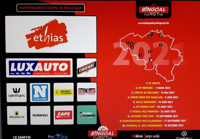 Corrigé. Mis à jour. Affiche. Voici un petit aperçu de la "COUPE DE BELGIQUE" ou "BINGOAL CYCLING CUP" des pros 2021. Attention de bien vous informer, il pourrait y avoir des annulations ou reports. Voir entête pour le calendrier. Qui présente des "anomalies" puisque le 16 juin est consacré à une autre épreuve ... . … Lire la suite « LA COUPE DE BELGIQUE PROS » #2021