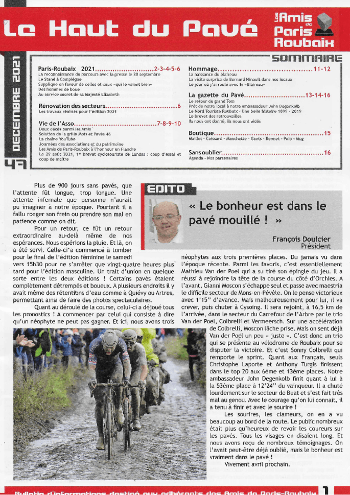 Photo. Page de garde de la brochure de DECEMBRE 2021. (n°47) Le bulletin d'informations destiné aux adhérents (membres, affiliés, militants, ...) vient de nous être livré. "LES AMIS DE PARIS-ROUBAIX" n'ont pas chômé ces derniers mois. Regardez plutôt le sommaire proposé. Il est juste un peu dommage de ne pas avoir été avisés que "LES … Lire la suite « LE HAUT DU PAVE ». #AmisDeParisRoubaix #Brochure #2022