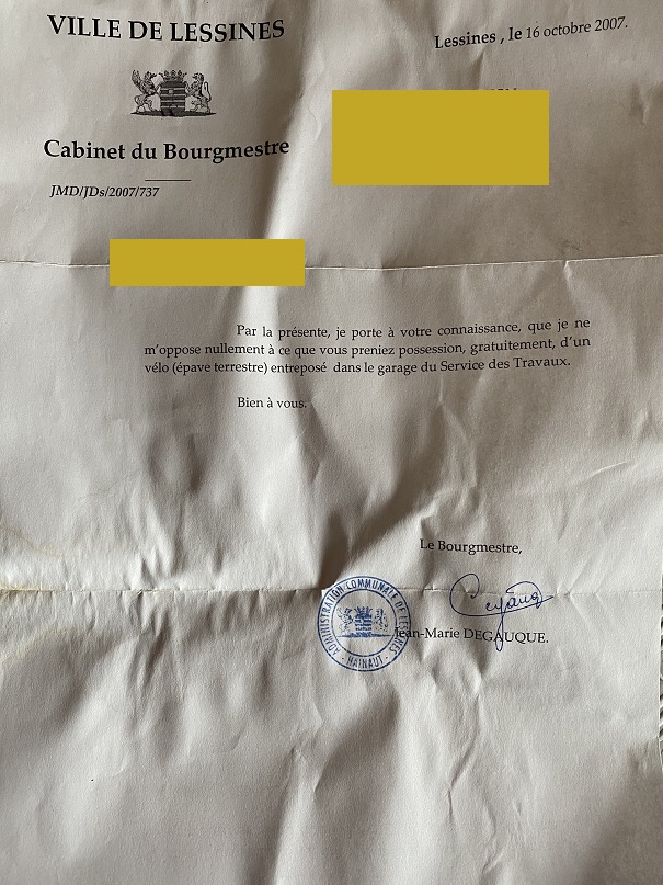 Photo. Un courrier de 2007. "L'EPAVE TERRESTRE". Identifier le propriétaire d'une bicyclette abandonnée sur la voie publique n'est pas chose aisée. Un vol ? Un accident ? Une perte consécutive à une alcoolémie ? Une chute ? ... . . Les cas peuvent être nombreux. Saugrenus quelques fois. Il fut un temps, la "plaque vélo" … Lire la suite BON A SAVOIR. #EpavesTerrestres #2022