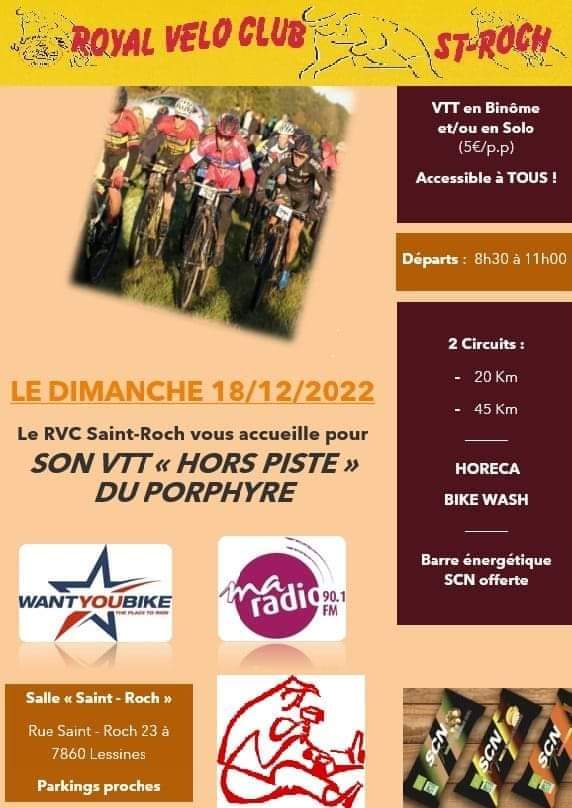 Affiche. Le "ROYAL VELO CLUB SAINT-ROCH" annonce son vtt hivernal. Merci au Président, Eric SOYEZ, pour l'envoi de l'affiche. "VTT HORS PISTE DU PORPHYRE" - 18/12/2022. Notez la date dans votre agenda. Nous reviendrons sur l'événement dans un petit mois.