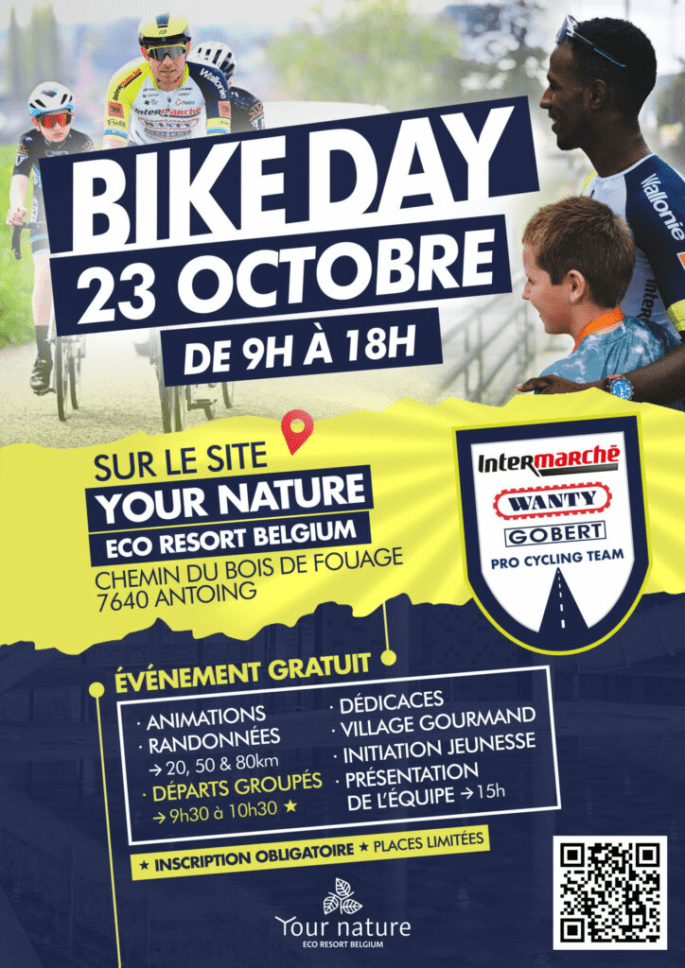 Affiche. Merci à JhonnyS de nous rappeler que le "BIKE DAY" de "IWG" sera organisé à ANTOING ("YOUR NATURE" - PARC ECO RESORT), le 23 OCTOBRE 2022 de 09h à 18h. Un grand événement à ne pas rater. #Proximité #Tournaisis Voici le PROGRAMME: 09h00 : Accueil et inscription à l’espace Bike Center 9h00-12h00 : départs libres des randos 80 … Lire la suite « BIKE DAY ». #IWG #23/10 #2022