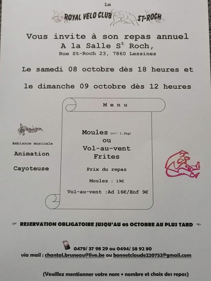 Affiche. Mr Eric SOYEZ, Président du "ROYAL VELO CLUB SAINT-ROCH", nous fait parvenir l'affiche relative au souper annuel. Merci à lui. Au menu, des MOULES ou/et du VOL-AU-VENT. La date : 08 et 09 OCTOBRE 2022. Lieu : Salle Saint-Roch (Lessines). Réservation obligatoire jusqu'au 05 octobre !!! Pour que les épreuves pour les jeunes puissent … Lire la suite SOUPER DU « ROYAL VELO CLUB SAINT-ROCH ». #Lessines #08-09/10 #2022