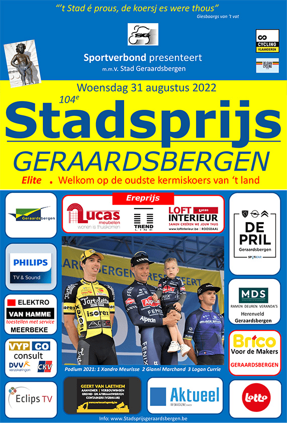 Les deux premières vidéos sont en ligne. D'autres posts sont à venir. Affiche. Le "GP VILLE DE GRAMMONT" est la plus ancienne kermesse de Belgique. Jusqu'à présent, elle avait tenu bon malgré la restructuration des calendriers et des catégories. Mais, ce sera sa dernière édition sous sa forme actuelle (104e). Les organisateurs travaillent sur un … Lire la suite « STADSPRIJS GERAARDSBERGEN ». #31/08 #ToutOuPresqueSurL’Epreuve #Grammont #2022