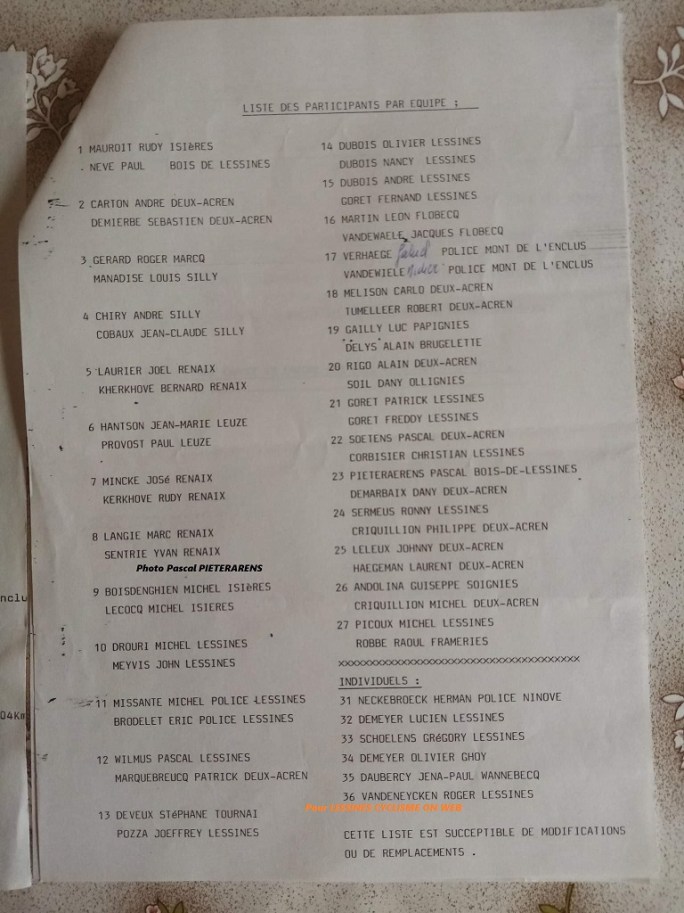 Photo. PascalPIT détient l'ensemble des documents relatifs aux "06h00" "POLICE" (CYCLOPOLICE). Liste des partants du "06h00". Merci "PIT" !!! La POLICE COMMUNALE de Lessines a toujours été très active en matière de sports : tir aux clays, tir à l'arc, cyclisme, marche, tournoi de ping-pong, de volley-ball, de natation, ... . Il y a plusieurs … Lire la suite IL Y A BIEN LONGTEMPS. #1989 #POLICE-COMMUNALE #06H00 #2022