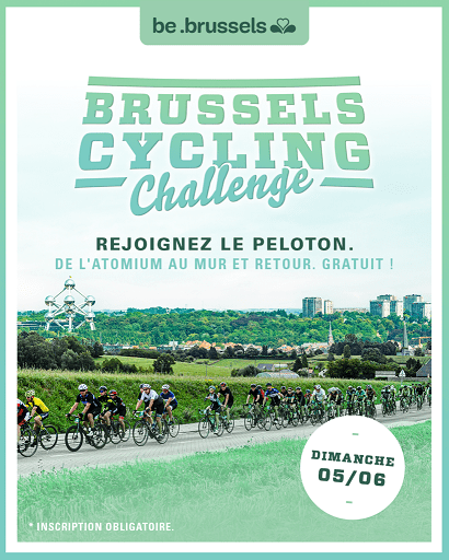 Affiche. Durant le weekend, une randonnée pour cyclos de 110 km est organisée dans le cadre de la "BRUSSELS CYCLING CLASSIC". (anciennement "PARIS-BRUXELLES") Départ du "CHALLENGE" à l'ATOMIUM. Réservation obligatoire via le site de "BCC". Un bon plan !!!