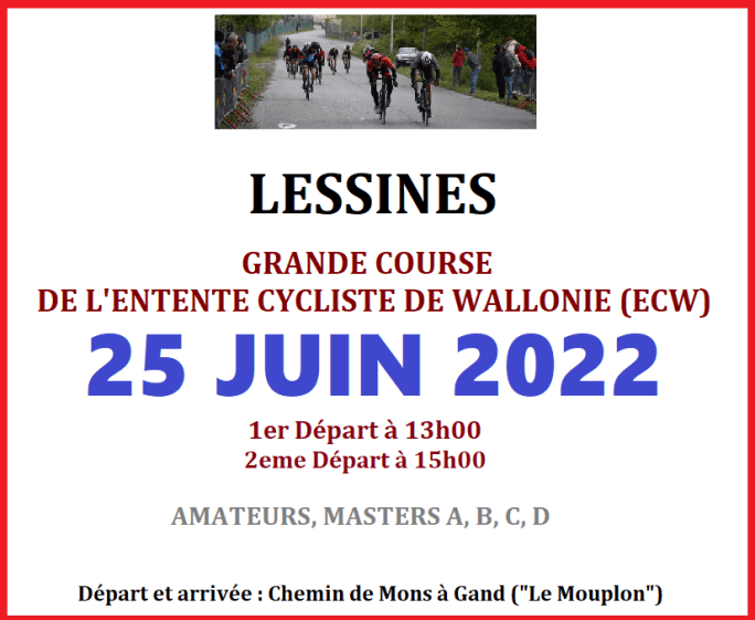 Pour prendre note. L'ENTENTE CYCLISTE DE WALLONIE sera à LESSINES (Carrières) le 25/06/2022. Ce n'est plus Georges BOUILLON qui sera à la manœuvre mais bien la direction de l'ECW avec Messieurs DRAUX et GRASSET. Plus sur ces compétitions pour non licenciés dans les prochains jours. "LCOW" sera sur place. Des équipiers seront d'ailleurs signaleurs.