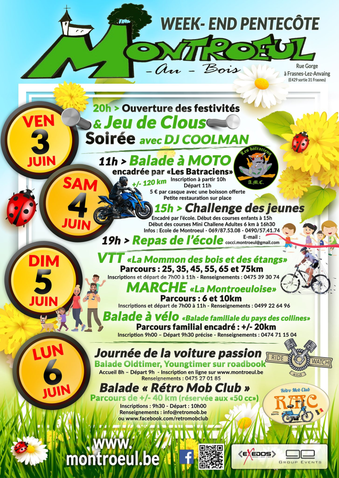Affiche. Du côté de Frasnes-lez-Anvaing, le programme sera aussi alléchant. "LA MONMON" pour le VTT et la route pour les familles. Sans omettre les festivités de la Pentecôte qui attirent souvent une très grand foule. La marche, la moto, ... . Les sportifs et les "amusettes" ont rendez-vous à MONTROEUL le lundi qui vient. #BonPlan!!!