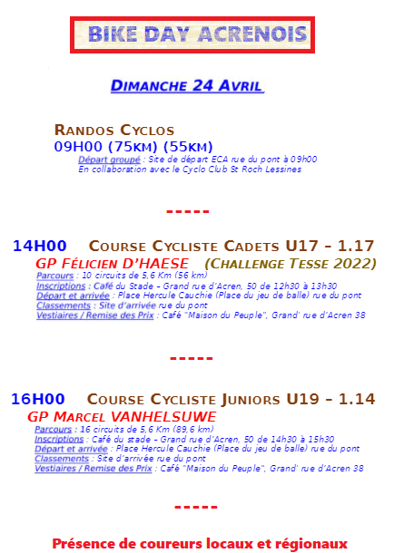 Affiche. Le 24 avril sera une grande journée pour les amateurs de cyclisme. L'ENTENTE CYCLISTE ACRENOISE" vous invite dans son fief. En effet, la matinée - 09h00 - s'ouvrira avec les cyclotouristes. A 14h00, les débutants prendront le départ. Enfin à 16h00, ce sera au tour des juniors. Le tout se déroule sur la Place … Lire la suite « BIKE DAY » A DEUX-ACREN. #24/04 #Cyclos #Déb #Jun #24/04 #2022