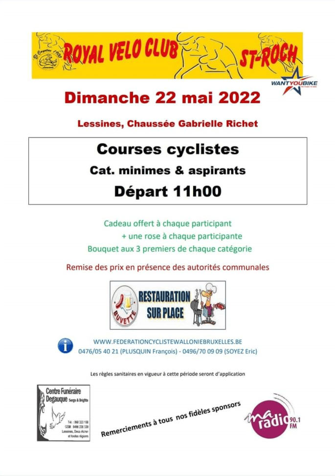 Folder FR. Merci à Mr Eric SOYEZ, Président du "ROYAL VELO CLUB SAINT-ROCH" pour le transmis des folders relatifs aux épreuves pour ASPIRANTS ET MINIMES qui se dérouleront à LESSINES - QUARTIER SAINT-ROCH - le 22 MAI 2022. Nous reviendrons en détail sur cette journée des CAYOTEUX. Folder NL. Tous restent en colonne de droite … Lire la suite PREPAREZ VOTRE JOURNEE DU 22 MAI. #Asp/Min #Lessines #2022