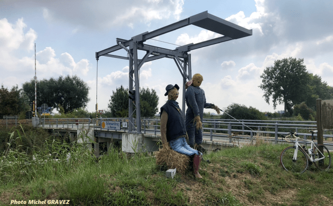Pêcher dos au canal, drôle d'idée !!! #Epouvantails #AVosVélos Merci à MichelG pour l'image. Ce post est le 6900e de ce site !!!